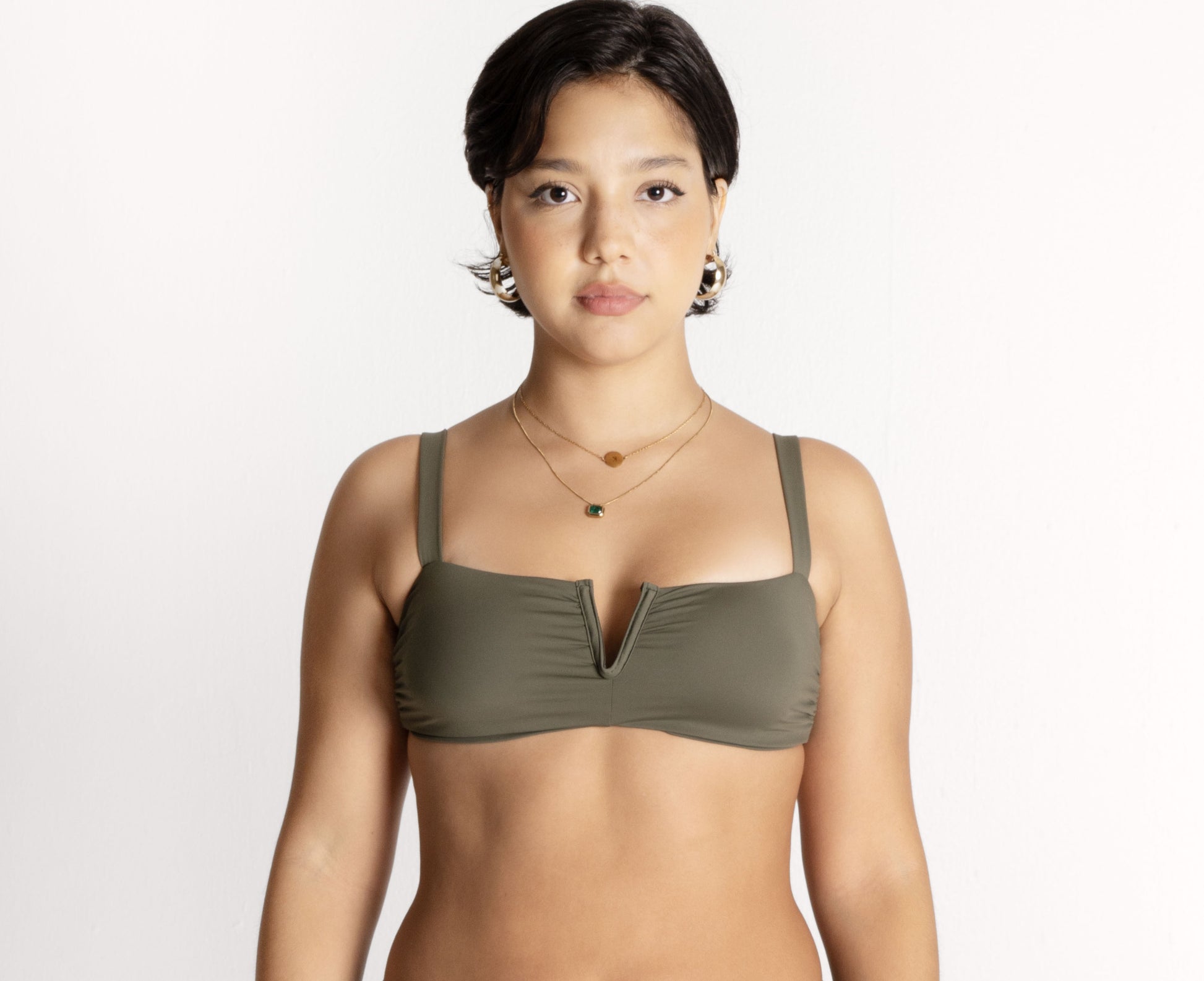 El bikini "Ilhabela", en tono verde musgo, combina un top estructurado con escote en V y un bottom de tiro alto que brinda soporte y elegancia. Es ideal para quienes aman sentirse libres, cómodas y conectadas con lo esencial.